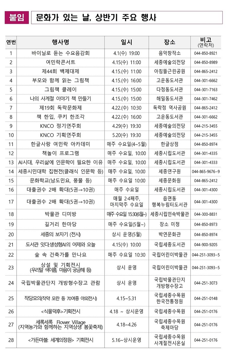 세종 소재 국가기관에서도 ‘문화가 있는 날’과 연계한 풍성한 문화행사를 만나볼 수 있다.