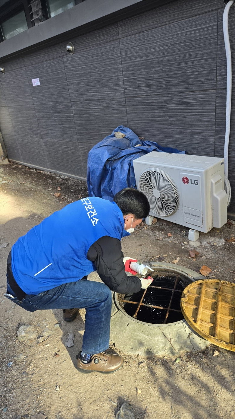 | ▲ 동절기 모기 유충 선제 차단을 위한 유충구제제 투여 작업을 하고 있다. |