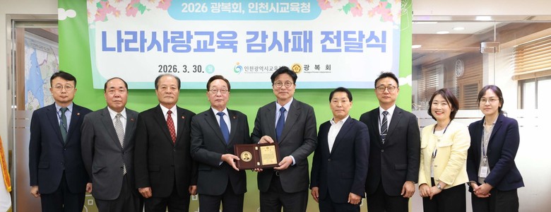[인천 세계타임즈=심하린 기자] 인천광역시교육청(교육감 도성훈)은 지난 30일, 그동안 추진해 온 ‘역사 바로 알기’ 교육 정책과 독립운동 정신 계승을 위한 다양한 교육활동의 성과를 인정받아 광복회로부터 감사패를 받았다.