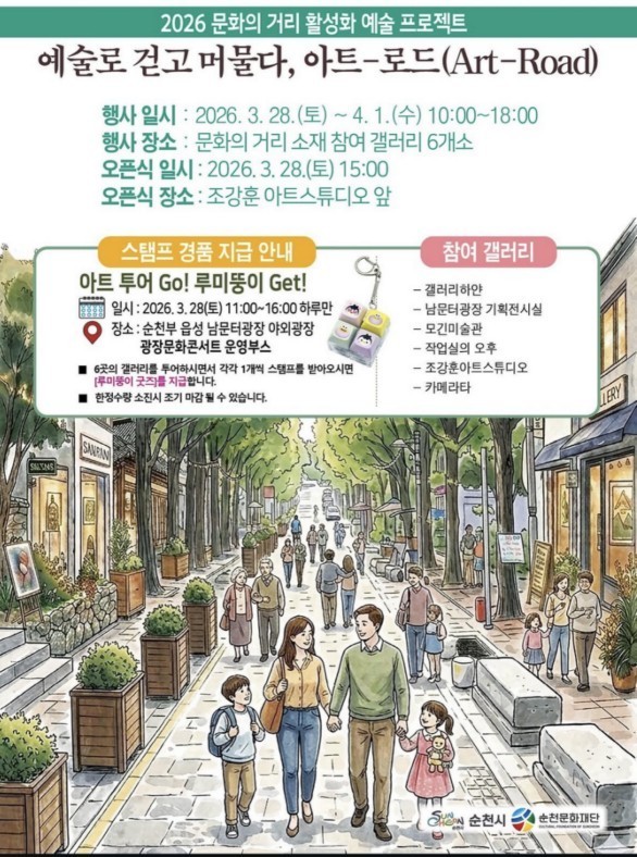 특히 행사 첫날인 28일에는 관람의 재미를 더할 ‘스탬프 투어’가 운영된다. 오전 11시부터 오후 4시까지 갤러리를 모두 방문해 스탬프를 모은 완주자에게는 순천시 캐릭터 루미뚱이 굿즈를 선착순으로 증정할 예정이다.
